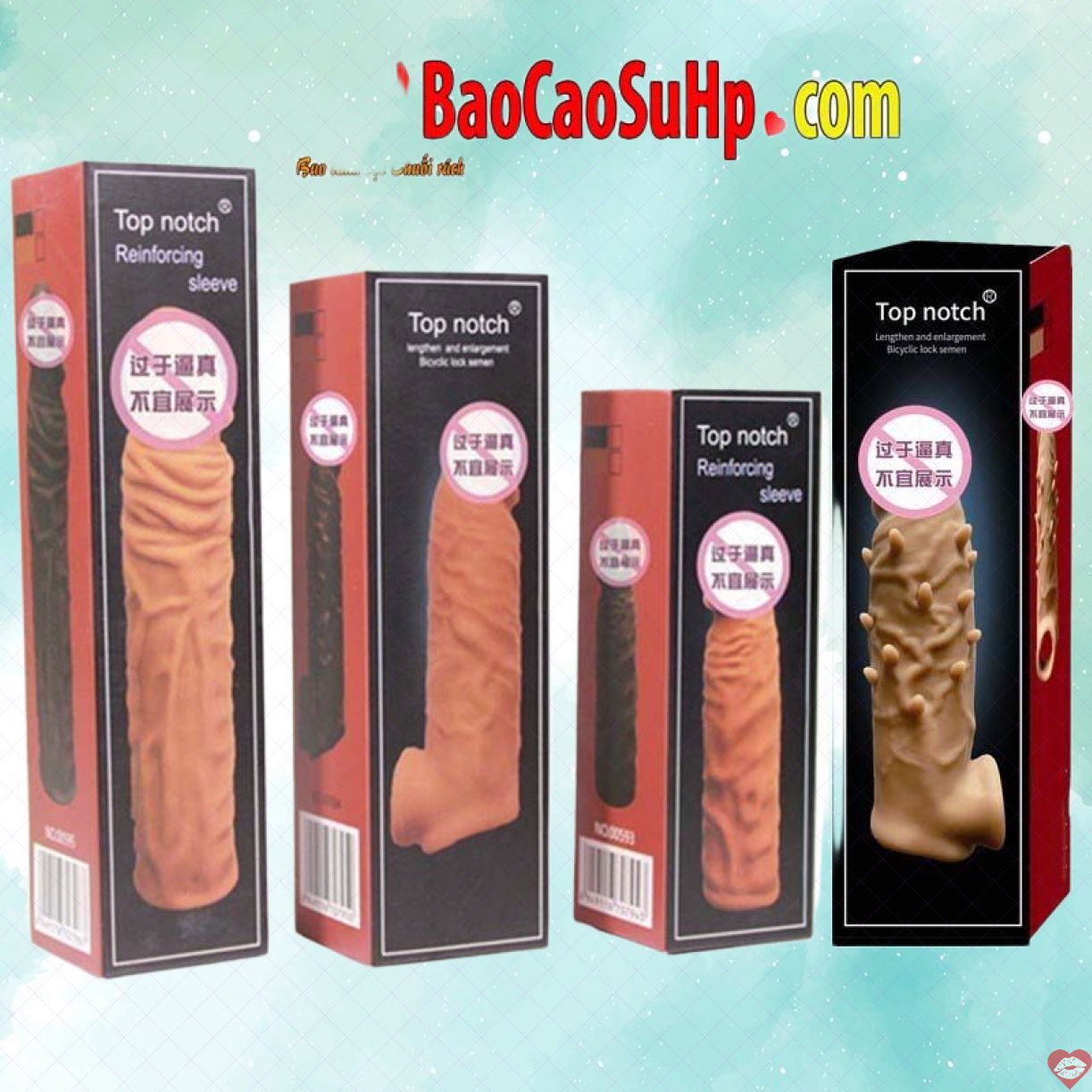 Bao cao su donden gai và gân có quai đeo Top notch là dòng bao cao su xuất khẩu của hãng Lovetoy hướng đến các đối tượng khách hàng nam giới có kích thước cậu bé khiêm tốn muốn tăng kích cỡ tức thì hay các cặp đôi bạn quá nhàm chán trong chuyện đó khách hàng , bạn nữ muốn nhận được nhiều kích thích hơn thông minh , muốn khám phá các khoái cảm mới lạ hơn khi âm đạo được khuấy động bằng những cậu bé gân guốc đầy râu đầy gai mà vẫn an toàn không gây đau.